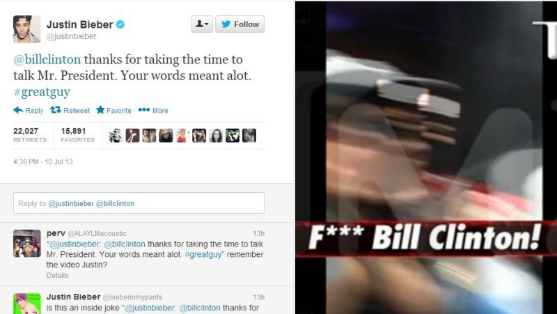 "@billclinton thanks for taking the time to talk Mr. President," Bieber tweeted. "Your words meant alot. #greatguy." Bieber didn't elaborate on the exchange, nor did Clinton respond to the tweet, but several gossip sites say it was Bieber who phoned Clinton to apologize for disrespecting him.