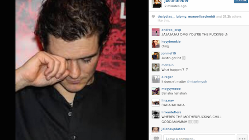 Justin Bieber just posted the above photo to Instagram. It's a photo of Orlando Bloom crying, or a photo of Orlando Bloom looking like he's crying, in case you were wondering if Bieber had an official comment on the most hilarious beef of the year/decade/century/millennium/Willennnium.