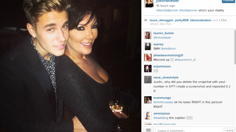 This is Justin Bieber posing with Kris Jenner. This is Justin Bieber tagging Kylie Jenner and Kendall Jenner, daughters of Kris Jenner, with the caption "who's your daddy." This is just Bieber, 20, joking about fucking his friends' mom, who is 58. Justin Bieber's 2014 Ibiza trip remains historic.