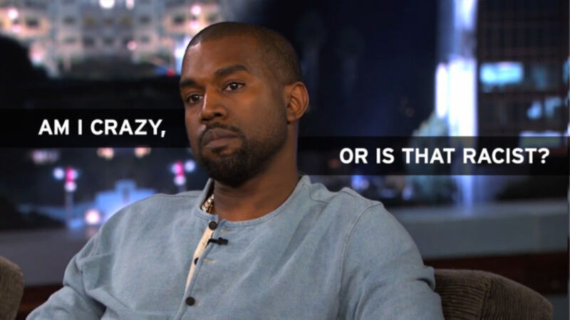 I believe there are numerous valid reasons to criticize Kanye West, but his rant on Jimmy Kimmel Live is not one of them. You may think he sounded crazy, but it wasn't a kind of crazy that was foreign to me—or, I'd assume, millions of other Americans. It was the crazy that comes from being stared at for daring to look different while eating breakfast with your mom. It was the crazy that comes from never knowing if you deserved to be kicked out of that bar. It was the crazy that comes from being the one person stopped by a cop amidst a sea of white people. "This is racist," you might say to the cop. "Prove it," he might say back. And at that moment, you can't.