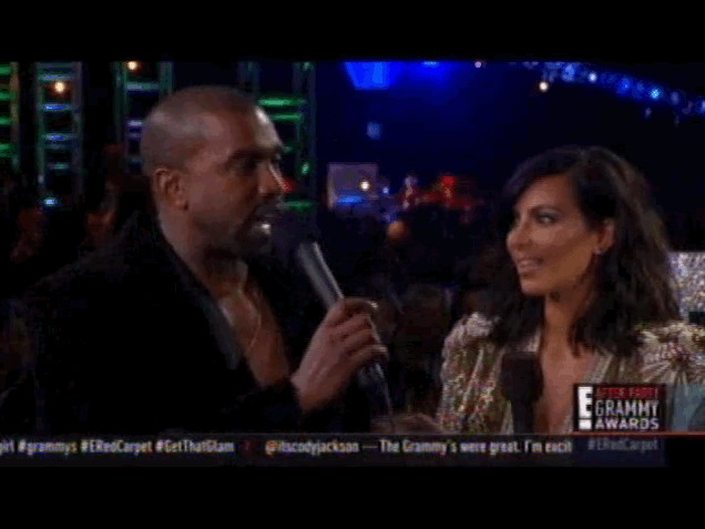 As an amped up Kanye West argued that Beck should have given his award to Beyoncé "to respect artistry," and ripped E!'s logos off his microphone after the Grammys Sunday, Kim Kardashian faced the biggest struggle of them all—smiling convincingly.