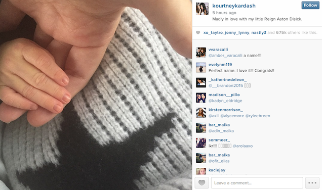 There was a slight chance Kourtney Kardashian might have given her new baby with Scott Disick a relatively normal (i.e. existent) but buzzy name. My money was on Isis or Ferguson. But no. Kourtney has laid down her cards, and along with her cards, her baby: Reign Aston Disick. And thus, we now have our baby Kardashian King to whom we bow. I believe Reign will grow up not just to own a very successful custom sock company like his uncle Rob but will also likely rule the free market economy. Perhaps he will be a Nobel Laureate. Anything is possible for this child, whose name is synonymous with power, prestige, expensive shit, and the social caste system.
