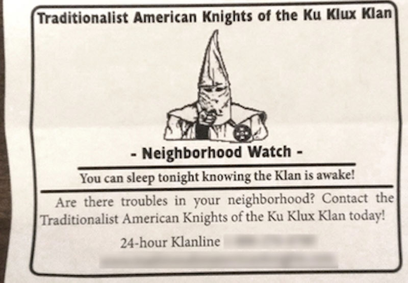 After a rash of recent crime, residents of Fairview Township, Pa. can finally rest at ease: Members of the local chapter of the Traditionalist American Knights of the Ku Klux Klan have started a neighborhood watch program in the township, complete with fliers and a 24-hour "Klanline."