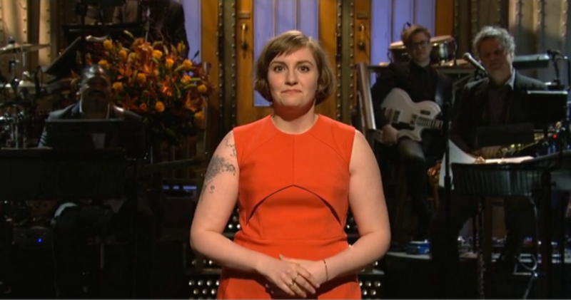 Everyone's favorite GIRL Lena Dunham was on comedy variety program SNL last night as a first-time host. She wasn't bad, though her opening monologue and two separate sketches referenced her show's gratuitous nudity and the sound of her voice was just a smidge grating. Nothing out of the usual.