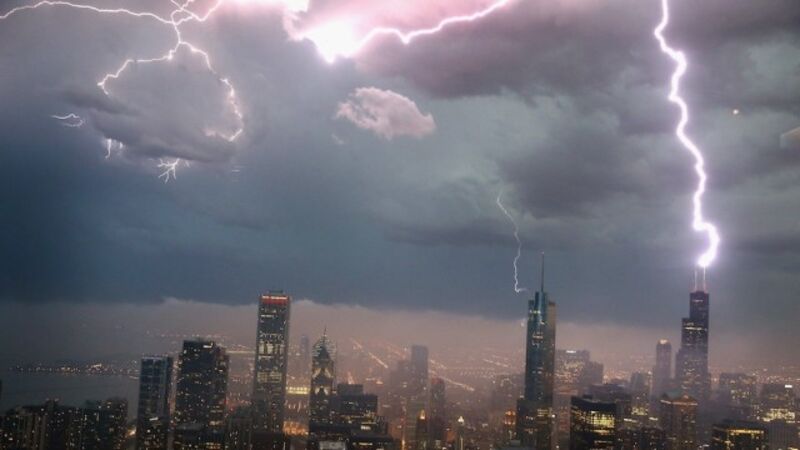 Lightning hits the Willis Tower (formerly the Sears Tower) and another building during a storm in downtown Chicago Wednesday evening.