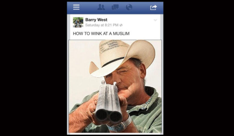 Barry West, a commissioner for Coffee County, Tennessee, apparently thinks there's only one appropriate way to wink at a Muslim, and it involves a double-barreled shotgun. He posted the above image to his Facebook timeline...where Muslim activists found it. And West's home phone number.