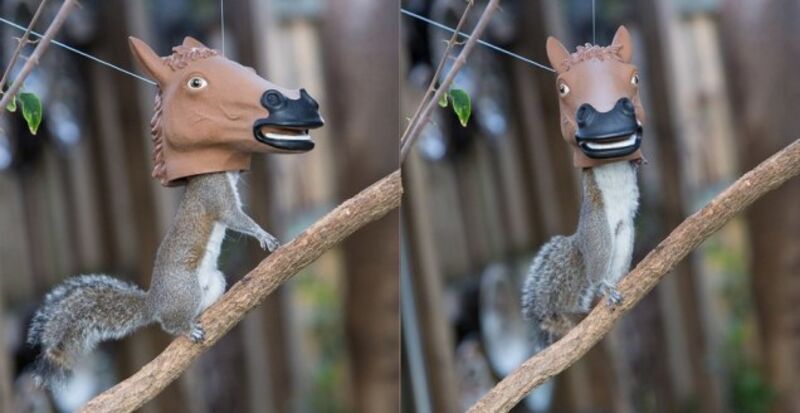 When the Nobel committee awards this year's prize for Simultaneously Feeding and Humiliating Squirrels, the inventors of this horse-head squirrel feeder are definitely going home with the hardware.