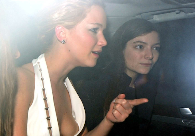 But lucky for the star who recently said she hates the Internet (wonder why), Jen had her best girlfriend in tow. Alt-pop's great grandmother Lorde was there to laugh at her boob and help her put it away. (Lorde is on The Hunger Games soundtrack).
