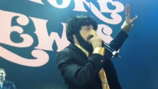 According to the rapping bumper sticker, he thought it would be fun to show up to Seattle's EMP Museum, where he was performing a secret show, in disguise. So he went to a costume store and picked things that he thought made him look like an amalgamation of famous men with dark shaggy hair/beards/big noses.