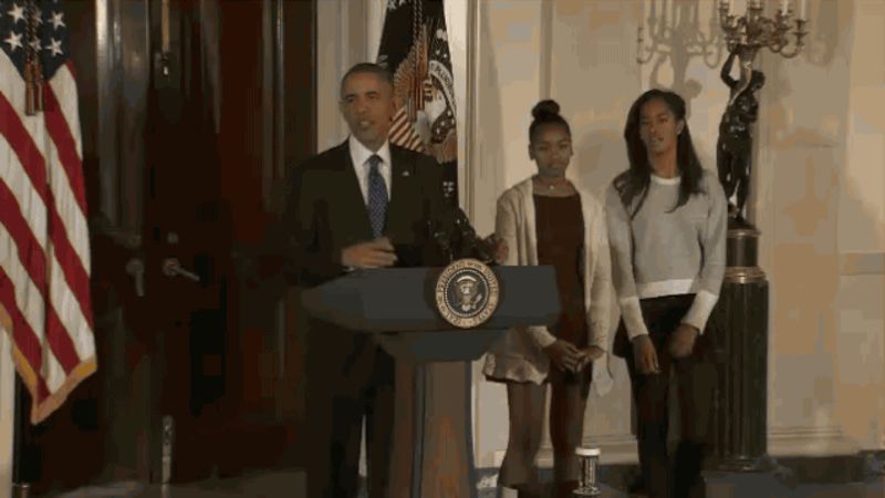 Today President Obama undertook the White House's stupid traditional Thanksgiving ceremony of "pardoning" a turkey. His daughters Malia and Sasha, 16 and 13, accompanied him. Their barely contained disdain for the production was utterly appropriate and utterly magnificent: