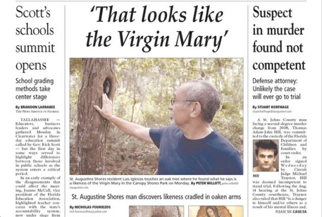 The front page, above-the-fold news in the St. Augustine (FL) Record today: "St. Augustine Shores man discovers likeness of Virgin Mary in tree."