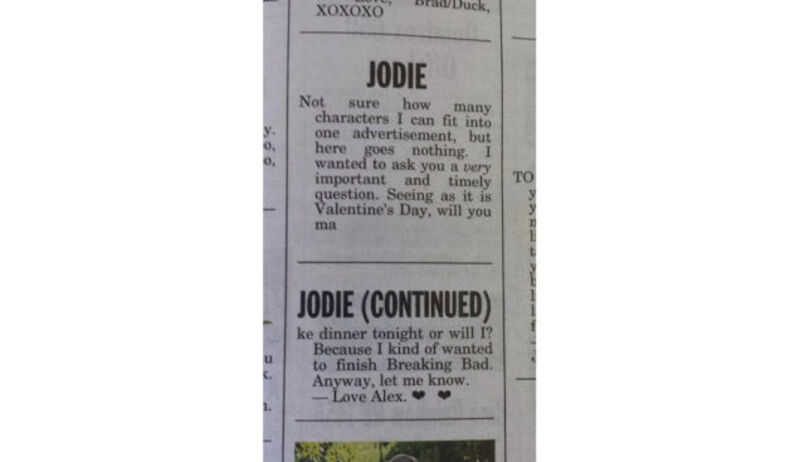 Yesterday, a man decided to take an ad out in his local paper with a special request for his date on Valentine's Day. It's... sort of sweet?