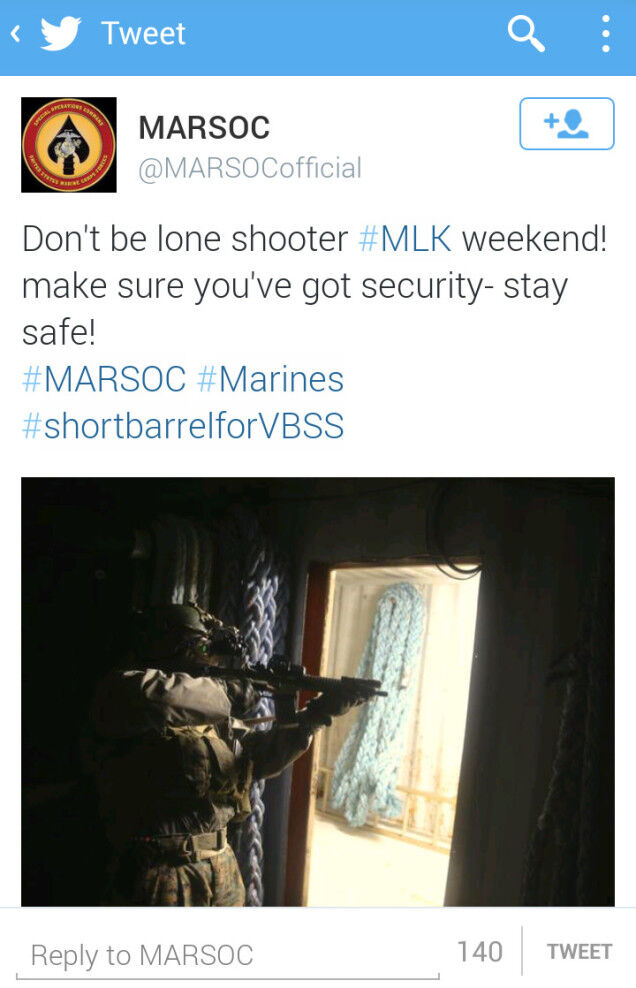 The Marine Corps Special Operations Command's official Twitter account urged its followers Friday morning not to be "lone shooters" over a weekend dedicated to Martin Luther King Jr., who was killed by a lone rifleman. The Corps quickly and wisely deleted the tweet.