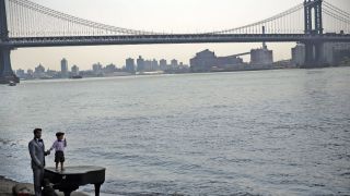 Mark Deliz and his son Sebastion pause at a piano underneath the Brooklyn Bridge on Tuesday in New York City. The grand piano that mysteriously landed on the beach last week has become an impromptu tourist attraction. While it is badly damaged, people venture out daily to test the keys. Image via Spencer Platt/Getty.