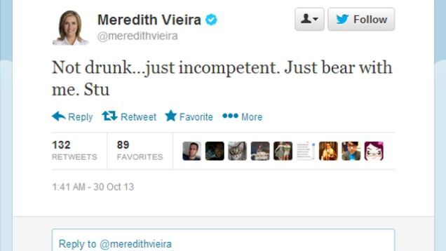 Meredith Vieira expressly denied being drunk while tweeting this lengthy stream of drunk consciousness, but it's unclear how else one might explain it.