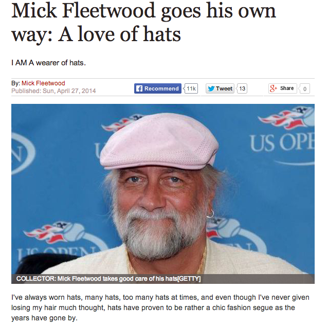 "I've always worn hats, many hats, too many hats at times," Mick Fleetwood writes in an op-ed entitled "A Love of Hats" published in the U.K.'s Sunday Express.