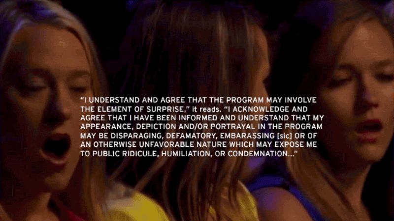 "I UNDERSTAND AND AGREE THAT THE PROGRAM MAY INVOLVE THE ELEMENT OF SURPRISE," it reads. "I ACKNOWLEDGE AND AGREE THAT I HAVE BEEN INFORMED AND UNDERSTAND THAT MY APPEARANCE, DEPICTION AND/OR PORTRAYAL IN THE PROGRAM MAY BE DISPARAGING, DEFAMATORY, EMBARASSING [sic] OR OF AN OTHERWISE UNFAVORABLE NATURE WHICH MAY EXPOSE ME TO PUBLIC RIDICULE, HUMILIATION, OR CONDEMNATION..."