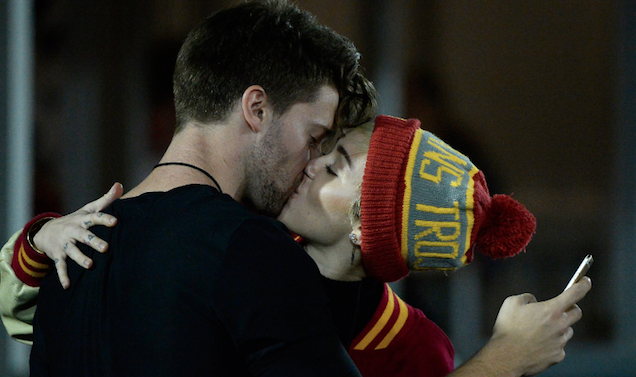 Alert siren alert: lovable rascal Miley Cyrus has an official new pseudo-Kennedy boyfriend. Arnold Schwarzenegger's son Patrick, 21, brought the pop star under the lights of the L.A. Memorial Coliseum last night to watch his college football game (USC beat Cal 38-30). He also took a selfie of them making out.
