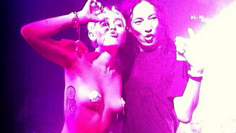 Update: A tipster who was at the Alexander Wang after-rave last night has shared this video he snuck of Miley lighting up on stage. "She was dying for the attention," he says.
