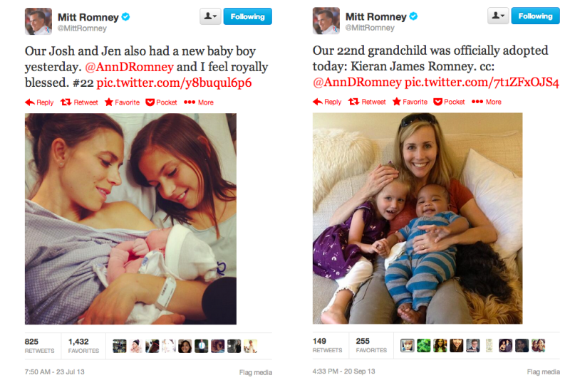 On the left: Mitt Romney, tweeting in July about grandchild "#22." On the right: Romney, today, welcoming his "22nd grandchild." Does the adopted one not count, or something?