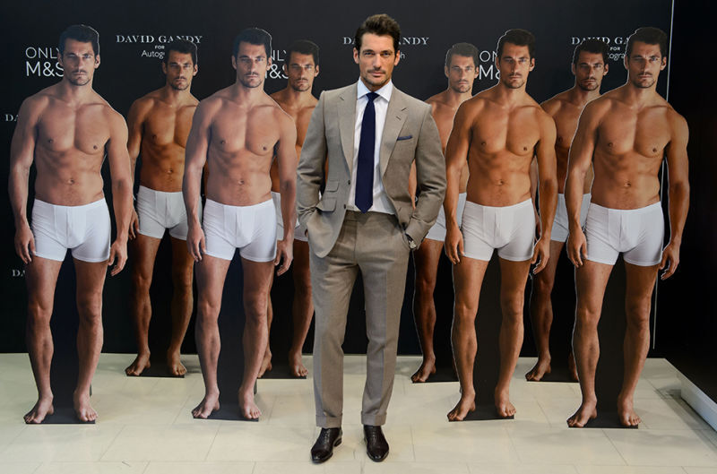 Model David Gandy poses with cardboard cutouts of himself wearing underwear from his new collection in London, Thursday. [Photo by Jonathan Short/Invision via AP]