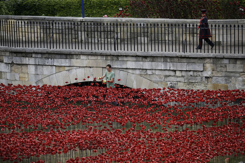 Moira Cameron, the first woman to join the Yeoman Warders, walks past the ceramic poppy art installation in the dry moat of the Tower of London, Sunday. "Blood Swept Lands and Seas of Red" opens Aug. 5 and features 888,246 poppies, each representing a member of the British military that died in World War I. Image by Matt Dunham via AP.