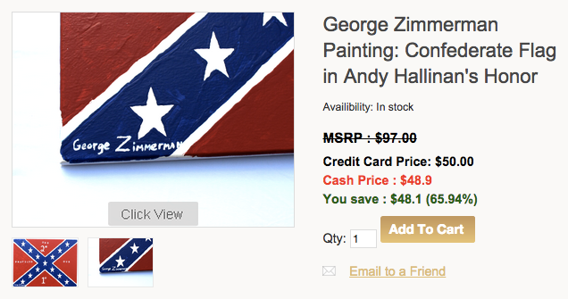 Once again proving the state’s status as a scary, right-wing version of Mad Libs, a Florida man who declared his gun store a “Muslim-free zone” announced a contest on Monday to win an original Confederate flag painting by George Zimmerman.