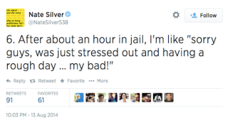 Nate Silver, a man frequently hailed as the future of journalism, gave a master class this evening on How Not To React To The News That Doesn't Involve You (Ferguson edition). In short, don't make it an occasion to tell the story about That Time You Were Arrested (as a white man) and the cops were actually nice and let you eat a burrito.