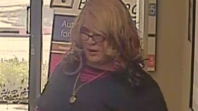 Police said the suspect was wearing a wavy blond wig, prescription glasses, navy blue scrubs and a light purple long-sleeved undershirt when he handed a note demanding money to the teller. No weapons were used and no injuries were reported, according to police.