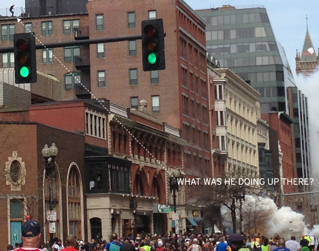 I was standing there all day, since about 10 in the morning and I have many many pictures, including some of the "man on the roof" enjoying his friends and loved ones at a very normal Patriot's Day rooftop BBQ. The final series of photos I have is of the mysterious man sitting in a lounge chair with a friend and then him jumping up and running over to the side to see what is happening. I think his friend ran over to the other side of the roof, or just happened to, at that moment, go back downstairs or something. Regardless, it's really pretty obvious in the photos what is going on. You can very clearly see his black shirt and jeans and grey hair. My final picture of the second explosion is a split second difference from the one all over the internet.