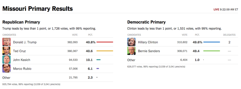 The state once known as an important presidential bellwether, is, as of this morning, still too close to call in both races. On the right, per the New York Times, Donald Trump leads Ted Cruz by .2 percentage points, with Kasich 30 points behind them in third. On the left, Clinton is up on Sanders, also by .2 percentage points. According to the St. Louis Post-Dispatch, the margin on both sides is actually closer to less than one-half of one percent.