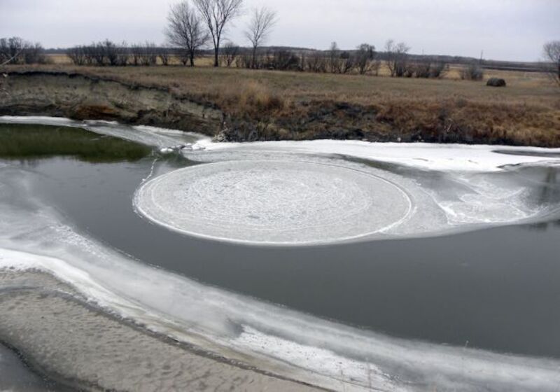 [North Dakota resident George Loegering saw this large spinning ice circle in the Sheyenne River while out hunting on Saturday. Members of the National Weather Service said a combination of cold, dense air last weekend and an eddy in the river likely caused the large spinning circle of ice bits to form. Photo by George Loegering via AP]