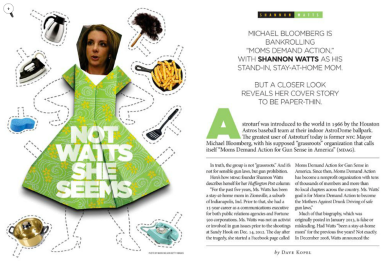 The story itself is typical of Kopel's single-minded blather, in which he finds it impossible and misleading that a proper "stay-at-home mom" could also run a consulting business while at home. No doubt Moms Demand Action, which is well-financed, has a whiff of Astroturf. No doubt it's also a rich indictment coming from the NRA, which purports to be the mouthpiece for America's estimated hundred million or more gun owners, while claiming (without proof) actual membership of 4 million, pulling strings on legislation nationwide, strong-arming politicians with its campaign dollars and endorsements, and downplaying its financial and political ties to the firearms industry.