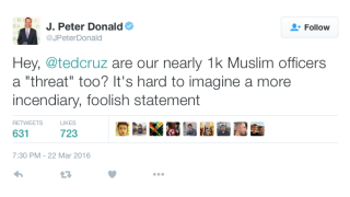 “Are our nearly 1k Muslim officers a ‘threat’ too?” J. Peter Donald asked Cruz. “It’s hard to imagine a more incendiary, foolish statement.” This was very well received by a certain kind of person.