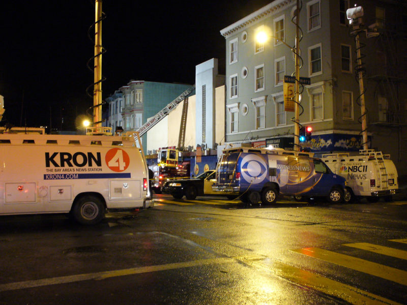 [Photo of Bay Area news vans—in San Francisco, not Oakland—by marshallstax via Flickr.]