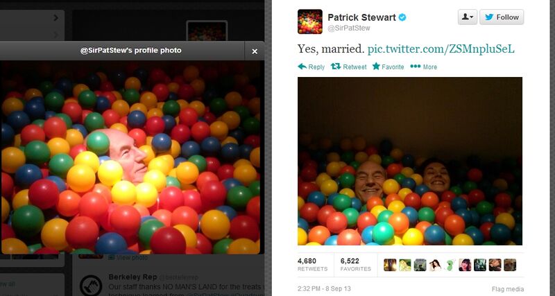 Sir Patrick Stewart confirmed over the weekend that he and his singer-songwriter girlfriend Sunny Ozell have indeed made it so (i.e. got married) by posting a short and sweet tweet featuring a photo of himself and Ozell sitting together in a ball pit.