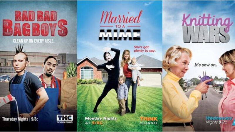 "The fact that you thought this was a real show says a lot about the state of TV," says a tagline pointing to mock promos for such upsettingly possible shows as Bad Bad Bagboys, Married to a Mime, Knitting Wars, and Bayou Eskimos.