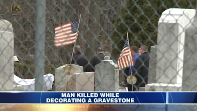 Ed Kublius, a caretaker at the St. Joseph's Cemetery, tells WNEP 74-year-old Stephen Woytack and his wife, Lucy, liked to visit the cemetery every Easter to pay their respects. Kublius was working nearby Monday when Woytack—tending to his mother-in-law's gravesite—got trapped underneath her gravestone. Via the Times-Tribune: