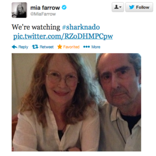 Philip Roth and Mia Farrow didn't, actually, watch Sharknado together—the photo is from a dinner party a few weeks ago, and the now-deleted Tweet was a joke—but it's good to know that the shark-weather thriller penetrated Mia Farrow's consciousness.