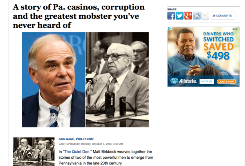 The story in question today is a Q&A with Matt Birkbeck, the author of a new book called The Quiet Don, which is about the organized crime figure Russell Bufalino. In the Q&A, Birkbeck says that organized crime pushed through the legalization of gambling in Pennsylvania with the help of Ed Rendell, when Rendell was governor. The story's illustration is two photos, juxtaposed: Rendell on the left, and Bufalino on the right.