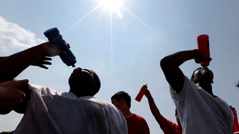 Players from the Central Catholic High School football team drink from water bottles during practice in Toledo, Ohio, Monday. The water ban that affected hundreds of thousands in Ohio and Michigan was lifted today. Image by Paul Sancya via AP.