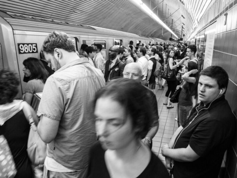 At rush hour, New York City subway platforms often grow extremely crowded. New people pour in every minute. Each train takes several minutes (or more) to arrive. A crowd grows. This effect is compounded by the fact that, at many stations, the arriving trains are already almost full. At these stations, during rush hour, only a handful of people, at most, are able to get onto any arriving train car. The rest of the commuters must wait on the platform for the next train, hopeful that it will have a bit more space.