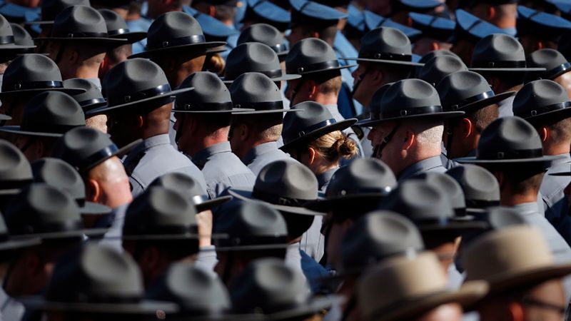 Police officers gather at the funeral for Pennsylvania State Trooper Cpl. Bryon Dickson in Scranton, Pa., Thursday. Dickson was shot and killed last Friday walking to his car outside the state police barracks. His alleged killer, Eric Matthew Frein, remains at large. [Photo by Matt Slocum via AP]