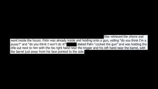 She and her boyfriend of one year, Track Palin, left a different residence together and were arguing the whole way home. Once they got to his home they argued in the car, then in the driveway . They were screaming and he was calling her names. [Redacted] told Palin that she had called the cops even though she had not, in attempt to calm him down and to scare him away from “touching her”. Palin approached [Redacted] and struck her on the left side of her head near her eye with a closed fist. [Redacted] got on the ground in a fetal position because she didn’t know what else he would do. Palin then kicked [redacted] on the right knee. [Redacted]’s phone was sitting on the ground in front of her. Palin took her phone and threw it across the driveway. She retrieved the phone and went inside the house. Palin was already inside and holding onto a gun, yelling “do you think I’m a pussy?” and “do you think I won’t do it?” [Redacted] stated Palin “cocked the gun” and was holding the rifle out next to him with the his right hand near the trigger and his left hand near the barrel, with the barrel just away from his face pointed to the side. [Redacted] was concerned that he would shoot himself and ran outside and around the house. She didn’t see where Palin went, so she went inside and up the stairs, where she hid under a bed. Shortly after, she heard Palin walking around inside looking for her. Palin left after not locating her.