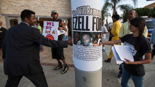 According to a police autopsy first obtained by the Los Angeles Times, Ezell Ford, an unarmed black man, was shot three times by police: once each in the right arm, back, and side. The skin surrounding the fatal gunshot wound to his back shows a "muzzle imprint."