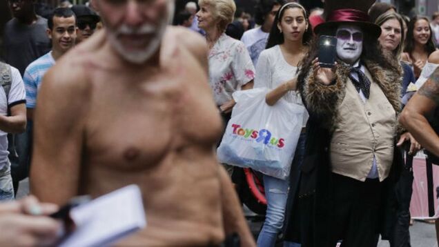 Political candidate George Davis strolled through Times Square Wednesday in the nude while Batman's nemesis Penguin snapped a photo. Davis is running for the Board of Supervisors in San Francisco. He's campaigning for the right to be nude in public. Image by Julie Jacobson via AP.