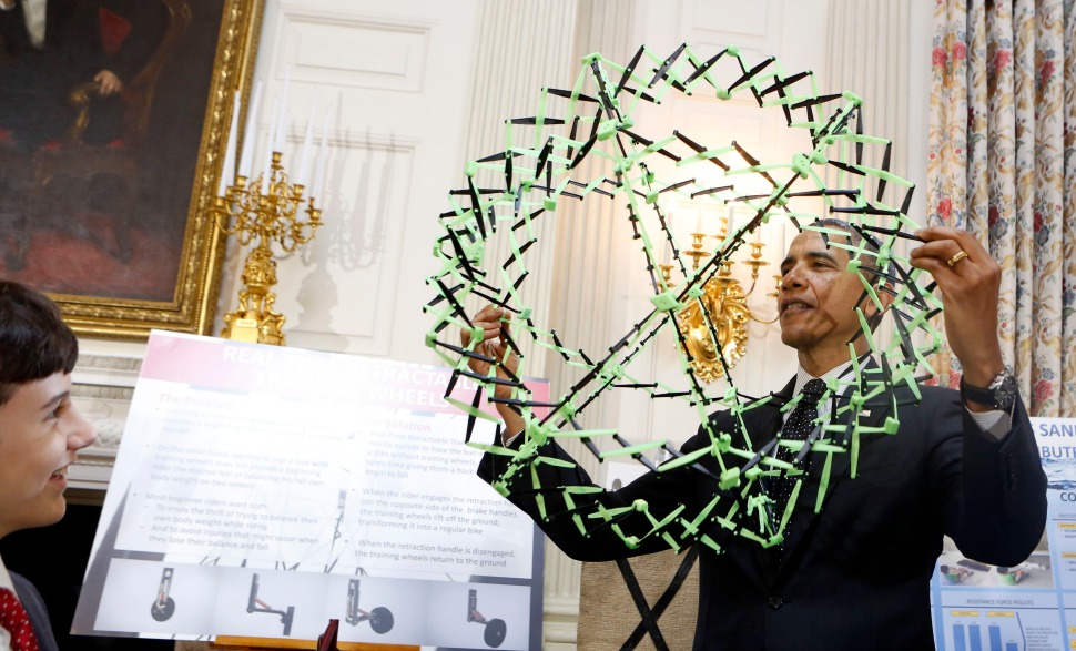 President Barack Obama looks at the project of Peyton Roberston, who won the Discovery 3M Young Scientist competition for his "sandless sand bags" project, during the 2014 White House Science Fair on Tuesday. Image via Aude Guerruccip-Pool/Getty.