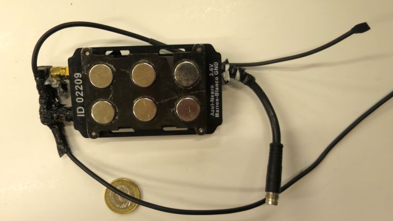 The device was magnetically mounted inside of the left wheel well of the car. The battery is attached by cable to the tracking device. The battery was magnetically mounted to the frame of the car. The tracking device was similarly magnetically mounted. The device itself has an external magnetically mounted GPS antenna. It has a very simple free hanging GSM antenna. The device included a Movistar SIM card for GSM network access. The entire device was wrapped in black tape.