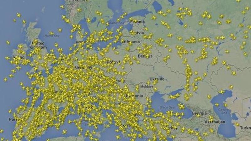 Radar shows flights moving away from Ukrainian airspace after Malaysia Airlines Flight MH17 crashed in eastern Ukraine today, killing at least 295 people.