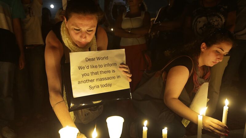 [image of Syrian women in Beirut, at vigil mourning the alleged chemical weapons attack on the suburbs of Damascus, via AP]